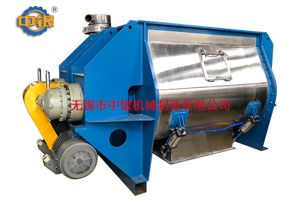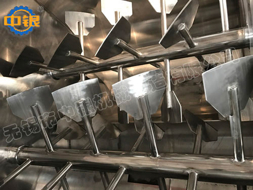 該機臥式筒體內(nèi)裝有雙軸旋轉(zhuǎn)反向的漿葉,漿葉成一定角度將物料沿軸向、徑向循環(huán)翻攪,使物料迅速混合均勻;為降低設(shè)備易損件的更換成本,槳葉葉片可做成兩片式,在葉片基座上墊一塊可移動小葉片,可直接更換磨損的小葉片,經(jīng)濟快捷; 出料形式一般為氣動(手動)翻板閥,圓弧閥門緊密嵌入筒內(nèi),與筒內(nèi)壁齊平,無物料堆積和混合死角現(xiàn)象;標(biāo)準(zhǔn)型有大開門小開門之分,大開門開口到筒邊,放料干凈快捷,殘留少。