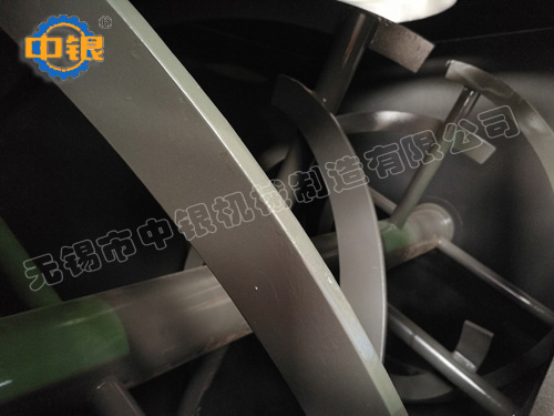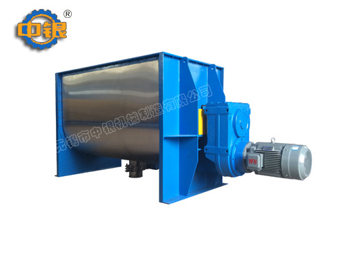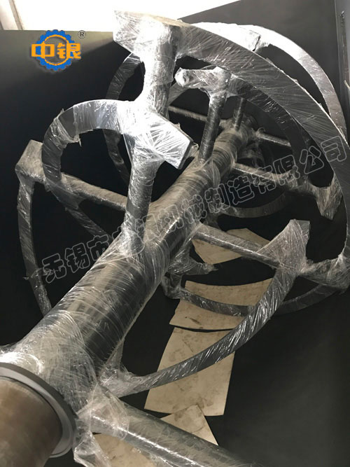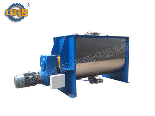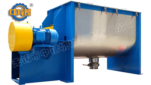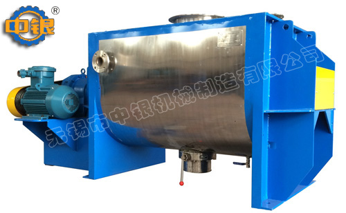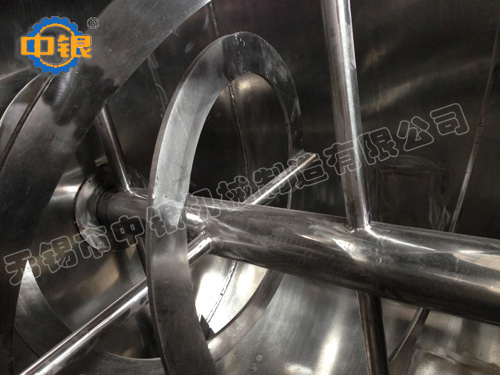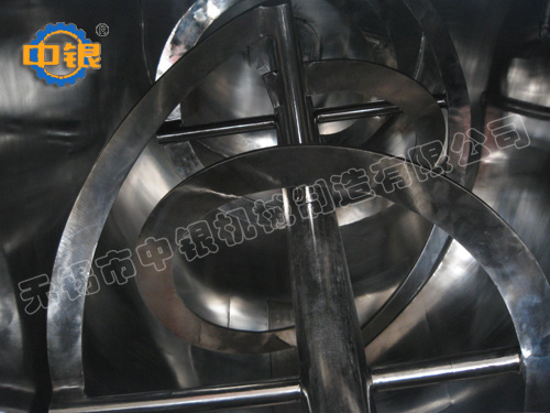 臥式螺帶混合機以高效、快速混合物料、由攪拌軸的螺旋帶運動下,使內外螺旋帶在較大范圍內翻動物料,內螺旋帶將物料向兩側運動,外螺旋帶將物料由兩側向內運動,使物料來回滲混,另部分物料被螺旋帶推動下,沒軸向徑向運動,從而形成對流循環。由于上述運動的攪拌,物料在較短時間內獲得快速均勻混合。